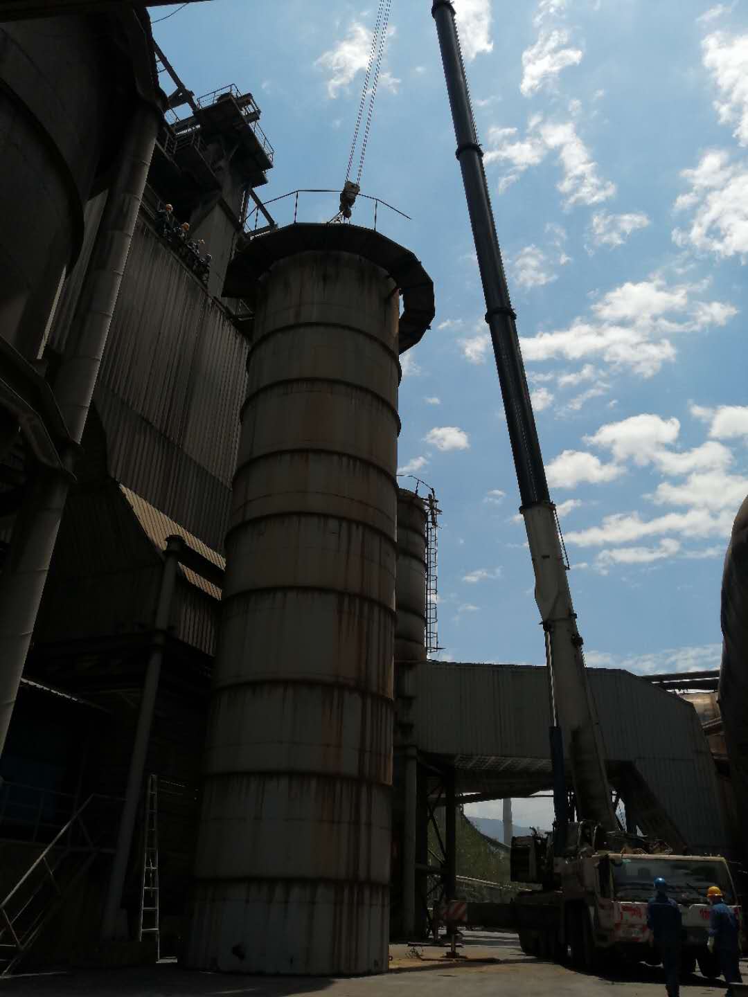 6月2日天氣晴朗,風(fēng)力1級(jí),具備良好的施工條件,7:30分130噸的吊車準(zhǔn)時(shí)到達(dá)拆除現(xiàn)場,檢修班長針對(duì)性的給班員講解具體的拆除工序,具體的安全措施、落實(shí)到個(gè)人、落實(shí)到互保對(duì)子。8:30分煙囪頂部的大蓋安全拆除,13:15分30噸重的第一節(jié)煙囪安全拆除,16:00分15噸重的第二節(jié)煙囪安全拆除。