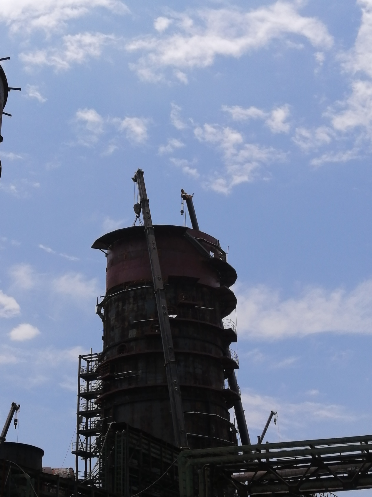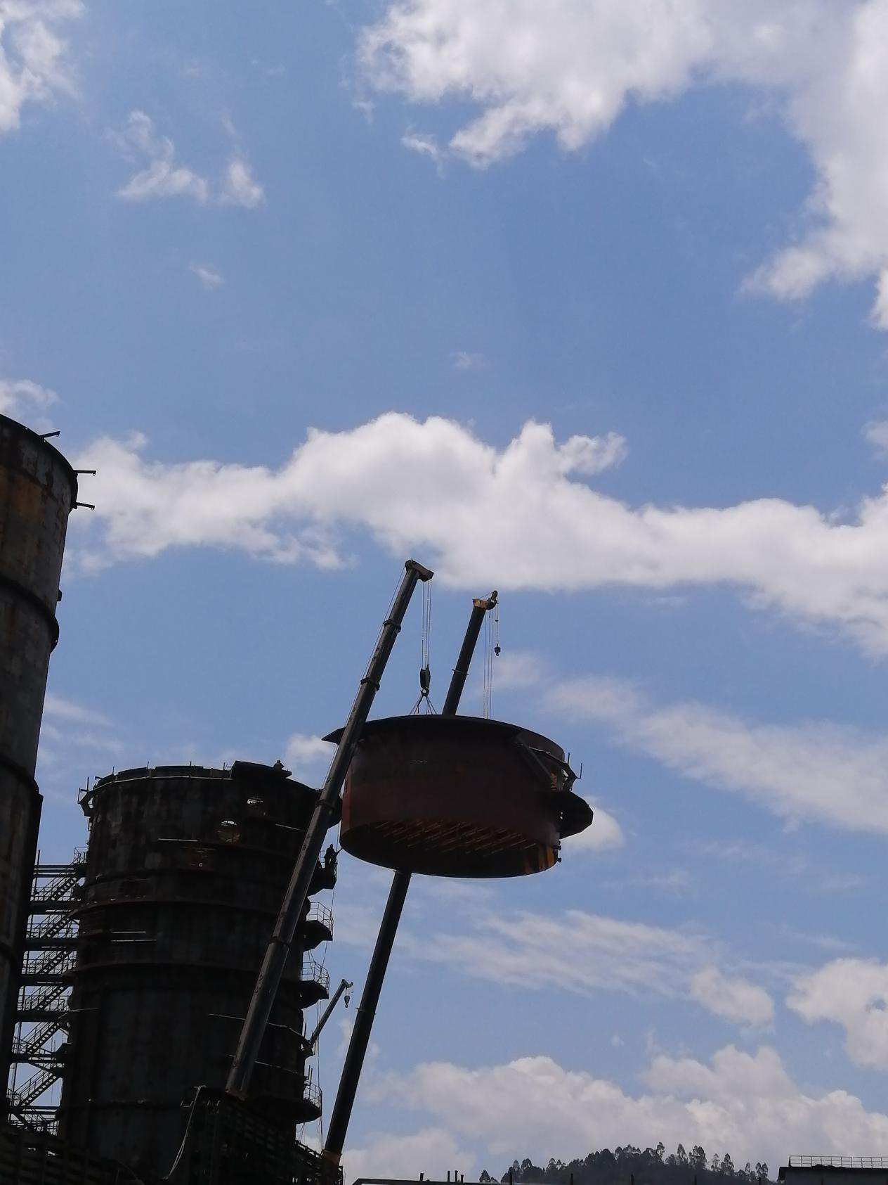 6月1日天氣晴朗,風(fēng)力1級,具備良好的施工條件,7:10分兩臺180噸的吊車準備就緒,吊裝人員系好了吊繩,技術(shù)員確定吊裝位置,安全員仔細檢查吊繩是否完好,各項工序準備就緒,指吊員準確指揮兩臺吊車同時起吊,12:30分56噸重的除霧器鋼結(jié)構(gòu)吊裝到位,穩(wěn)穩(wěn)的焊接在脫硫塔頂部。此次除霧器鋼結(jié)構(gòu)的成功安裝為10月31日順利投產(chǎn)奠定了堅實的基礎(chǔ)。