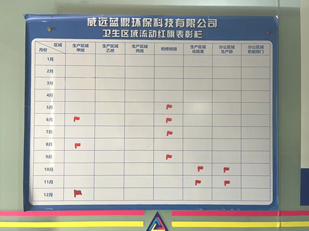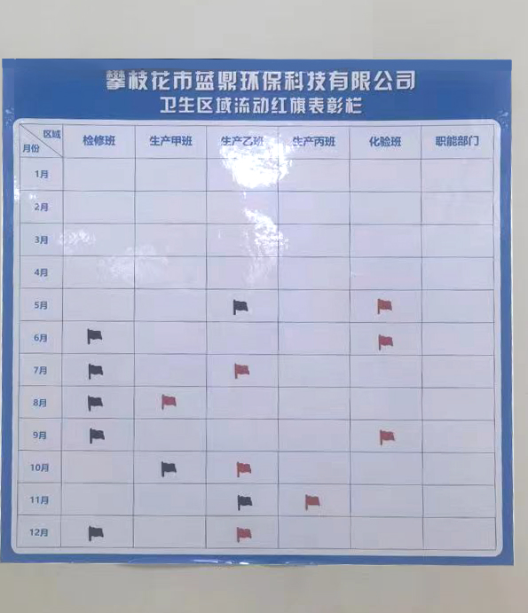 為促進(jìn)工作環(huán)境衛(wèi)生持續(xù)向好發(fā)展,2023年5月,集團(tuán)為各公司做了衛(wèi)生分區(qū)與責(zé)任劃分,同時(shí)設(shè)立衛(wèi)生流動(dòng)紅旗制度,以評(píng)估每個(gè)班組的衛(wèi)生清潔情況。紅旗代表該班組的本月衛(wèi)生情況最好,黑旗則代表衛(wèi)生情況不佳,需要整改。到12月底,攀藍(lán)鼎、西昌藍(lán)鼎、威遠(yuǎn)藍(lán)鼎2023年度各個(gè)班組的衛(wèi)生流動(dòng)紅旗評(píng)選結(jié)果已出爐。