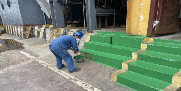 工作開展之前,安全員陳江嚴(yán)格按照安全環(huán)保管理要求,對防腐刷漆工作中可能存在的高空墜落、油漆飛濺等危險因素詳細(xì)辨識,根據(jù)實際需要配備安全帶、防護(hù)面罩、警戒帶等防護(hù)器具,現(xiàn)場講解安全防范措施,按照班前會流程進(jìn)行安全宣貫。廠區(qū)刷漆的同時,廠區(qū)道路兩旁的道沿也受到了特別“呵護(hù)”:水處理生產(chǎn)班組自行組成刷漆小分隊,在蒸發(fā)全廠范圍開展了“亮化廠區(qū)環(huán)境,提升廠容廠貌”道路沿石警戒線義務(wù)刷漆。生產(chǎn)班組采用黃黑相間油漆粉刷,對全廠所有道路沿石進(jìn)行刷漆。本次刷漆百分百覆蓋廠區(qū)道路沿線,共計約300多米。