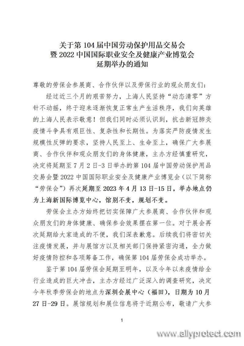 經(jīng)過近三個月的艱苦努力,上海人民堅持“動態(tài)清零”方針不動搖,終于迎來逐漸恢復(fù)正常生產(chǎn)生活秩序,我們向英雄的上海人民表示敬意!但我們同時必須認(rèn)識到,抗擊新冠肺炎疫情斗爭具有艱巨性、復(fù)雜性和長期性。為落實嚴(yán)防疫情發(fā)生規(guī)模性反彈的要求,堅持人民至上、生命至上,確保廣大參展商、合作伙伴和觀眾朋友們的身體健康,主辦方經(jīng)慎重研究,決定將延期至7月2日-3日舉辦的第104屆中國勞動保護(hù)用品交易會暨2022中國國際職業(yè)安全及健康產(chǎn)業(yè)博覽會(以下簡稱“勞保會”)再次延期至2023年4月13日-15日,舉辦地點仍為上海新國際博覽中心,館別不變,規(guī)劃不變。